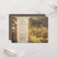 Rustic wedding invitation with beautiful forest scenery and wedding invitation text written on the old wood board. Romantic invite for your countryside wedding in the woods with spruces and other wild trees decorated with string lights.