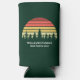 Cool matching family reunion seltzer can coolers in green for the whole group on a nature outing or camping trip. These custom keepsake gifts feature a beautiful vintage sunset over a forest of pretty trees under your personalized text.
