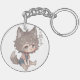 Kawaii chibi wolf kid in denim overalls and a striped shirt. Soft gray fur, blush cheeks, and a warm, woodland charm—perfect for playful, nature-inspired apparel.