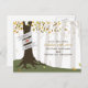 A fall wedding save the date postcard featuring an illustration of a tree in the forest. Tree has autumn leaves, exposed roots, and a trunk wrapped with banner that can be customized with bride & groom's names.