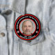A tribute button for friends and family to wear at a funeral with a photograph of your loved one and the words "FOREVER MISSED BUT NEVER FORGOTTEN" framing the picture with their name and dates.