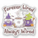 Celebrate the beautiful chaos of caffeine dependency with this relatable and energetic sticker. Featuring the phrase “Forever Tired, Always Wired”, this artwork is accented with illustrations of various coffee brews—from espresso shots and French press to drip coffee and iced lattes. It’s the perfect tribute to the eternally exhausted and endlessly caffeinated.