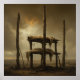 In a barren landscape, a two-story wooden structure stands tall, draped with tattered cloth and surrounded by ominous clouds. The muted colors and desolate setting evoke a sense of solitude and mystery.