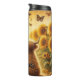 This is a heartwarming and whimsical illustration featuring two adorable, fluffy highland calves from behind, facing a field of sunflowers and a bright, glowing sun. The scene is surrounded by butterflies, and the word "forever" is written in a script font above. The entire image exudes a sense of warmth, love, and natural beauty.