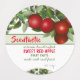 Pommes rouges entières accrochées au milieu de feuilles verts.