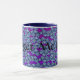 Purple background with blue forget-me-not flowers and caption "forget me not" on a coffee mug with blue handle