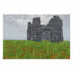 A 3D scene created in Vue, depicting the site of an ancient battle, with only the crumbling ruins of a medieval stone tower and red flowers in the grass to commemorate it. The falling rain and soft watercolor effect enhance the sadness of the hilltop scene.