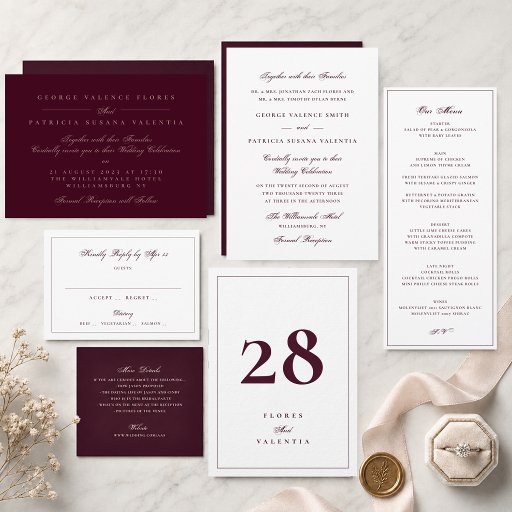 The layout includes space for guest names, attendance response, and dinner selection, creating a practical and beautifully coordinated card for your wedding suite. The deep burgundy colour adds warmth, depth, and formality, making it especially suited to elegant evening weddings and traditional receptions.