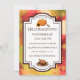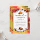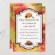 Formal invitation with artsy leaves in the background and text in a frame with a pumpkin, sunflower, acorns, and a cooked turkey.