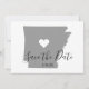 Couleur personnalisée gris Arkansas forme carte avec une sauvegarde de la conception de date pour les personnes se marier dans un lieu mariage à Little Rock AR. Les symboles de texte du coeur peuvent être customisés et déplacés pour d'autres endroits. Customisez la couleur de la forme d'état pour correspondre à votre palette de couleurs mariage. Faites connaître à vos amis et à votre famille l'emplacement de votre mariage avec un symbole de texte cardiaque que vous pouvez déplacer. Les styles de police de calligraphie moderne et élégant sont personnalisables.
