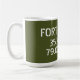 Coffee mug featuring Latitude and longitude map coordinates for Fort Bragg, near Fayetteville, North Carolina. Stencil style white font on Army green background.