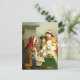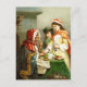 Vintage illustration of an old woman reading the palm of a young girl. The girl and her brother are dressed in colonial style clothes, as is the fortune teller. On the table are some books, decks of cards, and gold and silver coins. There is also a cute cat in a basket and a wise looking owl.