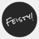 Feisty! écrit en blanc, moderne et tendance police typeface sur un autocollant noir & blanc classique. Cette conception est disponible en deux tailles (grande 3" avec 6 à une feuille ou petite 1,5" avec 20 par feuille). Vous pouvez également choisir une finition brillante ou mate. Bien qu'il soit également disponible dans de nombreuses formes, ce design n'aura pas l'air bon sur tous (sauf si vous le modifiez), Si vous choisissez une option autre que celle affichée, assurez-vous de le prévisualiser avant de commander - juste pour vous assurer que les résultats vous plaisent.