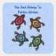 This square sticker bookplate label is blue with four black turtles with abstract designs on their shells in multiple colours of red, blue, yellow, and green. Customize your text with the templates.
