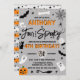 These fun and stylish invitations are perfect for anyone celebrating a 4th birthday this Halloween. The design features everything spooky from a black cat with flying bats to a spider's cobweb, ghosts, a witches broomstick, skull & bone, magic glass ball and a jack-o-lantern pumpkin all in black, white, grey and orange colours. The template wording is easy to personalize and your party guests will be in for a scare when they receive these invites in the mail!