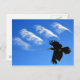 Four feather shaped clouds lined up in the sky with a raven flying in the foreground.