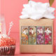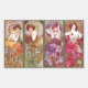 Four beautiful Mucha paintings each a different coloured floral colour. Orange, purple, red and green