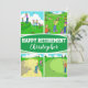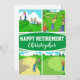 Happy Retirement. Golfer theme retirement card. Four very funny golf illustrations. In one, a golfer is taking a tee-off shot on a golf course. He miss-hits the golf ball and his fellow golfers find this hilarious and are laughing uncontrollably. In another a golfer takes a shot on a golf course and has numerous lucky rebounds which amazes his friends. Also a cartoon where a golfer is stuck in a bunker and not having much luck getting out of the sand trap. Finally, a golfer is on the green, but misses his putt by a fraction. Cartoons are by UK cartoonist Nigel Sutherland.