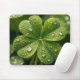 A close-up image showcases a green clover leaf adorned with sparkling raindrops, illuminated by the fresh morning light, which highlights the leaf's intricate details and texture