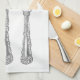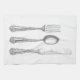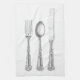 Illustration vintage d'une fourchette, d'un couteau et d'une cuillère, sur une grande serviette de cuisine. Customisez à votre goût !