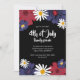 Retro style Fourth of July party invite. Red, white and blue flowers on a black background. Personalize the front and back with your party details!