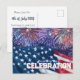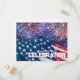 Send a festive Independence Day celebration postcard to friends and family. The design features a textured, painted American flag waving beneath vibrant, artistic fireworks. Use this as a striking invitation for your Fourth of July party.