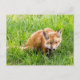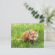 This adorable red fox cub (kit) sits in tall grass outside its den.