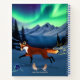 A red fox (Vulpes vulpes) running through a snowy, winter night with the Northern Lights aglow over distant mountains; sparks emanate from the fox's tail. Customize this product by adding your own text.