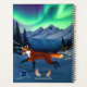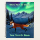 A red fox (Vulpes vulpes) running through a snowy, winter night with the Northern Lights aglow over distant mountains; sparks emanate from the fox's tail. Customize this product by adding your own text.