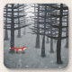 A wild red fox stands among the pine trees in a dark forest. A landscape painting for wildlife, nature and animal lovers.