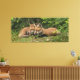 Two red fox kits are pictured lying close together in the shade of evergreen trees.