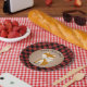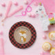 Baby shower paper plates featuring an illustration of a baby fox with a red and black lumberjack plaid background.