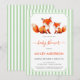 The text is in a pale green frame on a pale green stripes background. In the upper part of the frame, above the text, there are 2 cute red foxes, the bigger mama fox and the smaller baby fox pup, painted in watercolor. Under them there is the text: the words "baby shower" and are written in a red handwriting script, the name in red caps, the date / time in black caps, the rest in smaller black caps. On the background behind the frame and on the back, there are only pale green and white stripes.