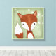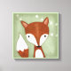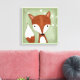 A digital painting of a whimsical fox is seen against the green wood-grained background. Little white flowers are seen on vines hanging in the right hand corner. Beautiful painting in soft colours is perfect for any woodland themed area, whether it be a baby nursery, daycare facility, or play room.