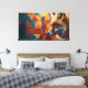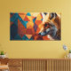 A fox stands confidently, displaying its vibrant orange fur. The background features a colourful geometric pattern, creating a lively indoor atmosphere.