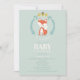 A baby shower invitation featuring an illustration of a fox inside a wreath decorated with flowers, leaves, and an acorn. Personalize the text.