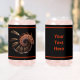 A multi-coloured (red, yellow and orange), spiralling fractal image, resembling a bird or feathered dragon, on a dark background. Customize by adding your own text on the reverse side. You may change both the text colour and font.