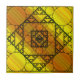 Three styles of hand-drawn fractals, including Siepinski triangles, Apollonian gaskets, and a similarly themed square design, make up the layers of this geometric mandala, overlaid onto a bright yellow and orange gradient. This tile can be framed to create a trivet or placed inside a wooden gift box lid.