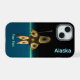 A brown-toned fractal image suggesting a highly-stylized Inuit hunter, wearing traditional fur clothing, holding a harpoon with an ivory head. The image is superimposed on a background depicting the dark polar winter. Text reading "Alaska" also appears in glowing blue and white. Customize by adding your own additional text.