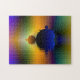 A fractal art Mandelbrot design with royal blue, purple, yellow-orange, black and teal colours.