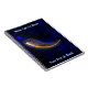 Features a fractal rendering of a shofar (ram's horn). The predominate colours are yellow, white and blue. All on a starry background. Customize by adding your own text in the spaces provided. For Yom Kippur or Rosh Hashanah.