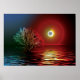 A fantasy image of a tree of glowing fractal lines standing in flowing water against a sunset sky. The image manipulation plugin creates dreamy contrasting colours of blue,green and red.