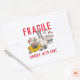 A confused cartoon guy has run his fork lift through a box labelled Fragile. A fragile sticker that hopefully catches the handler's eye with the funny cartoon.