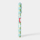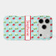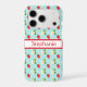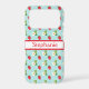 Ce mignon boîtier de téléphone cellulaire a un arrière - plan bleu ciel pâle et un motif de fraises rouges et de fleurs de plante de fraises tout autour. Vous le personnalisez au centre avec votre nom à l'intérieur d'un rectangle bordé de rouge.