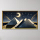 Stylized pyramids, geometric, crescent moon, star constellations, muted gold, navy hues.