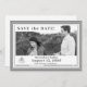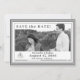This design features a silver and white border framing entire design. Heading at top left reads, "Save the Date!" in a silver print.