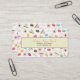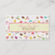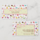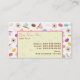 Un carte de visite comportant une conception se composant des macarons français dans diverses couleurs, rose, vert, et tasses de thé beiges, fleurs roses d'anémone, et texte de "Bonjour" dans le rose et le brun. Personnalisez le texte sur l'avant et le dos avec votre information.