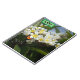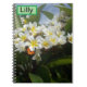 Pictured on a tree are pretty yellow and white Frangipani flowers with a orange butterfly,