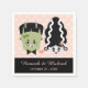 These pink and black Love at Fright Halloween themed couples wedding, couples and bridal shower, engagement party, rehearsal dinner and anniversary celebration paper napkin with the monster of Frankenstein and the Bride of Frankenstein on a heart polka dot background are more mushy than monstrous and more sweet than spooky. The groom wears a bow tie and the bride wears a flower with a printed diamond look solitaire in her hair. Please note, there are no 3 dimensional embellishments added to this design. It is printed flat. Add the names of the bride and groom or happy couple and their event date. Artwork © Chrissy H. Studios, LLC. All Rights Reserved.