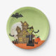 A whimsical Halloween design with a cute Frankenstein carrying a pumpkin filled with treats with a haunted house and full moon and black bats. Background is a pale green with orange border. Coordinating pieces available. Created with some artwork by J.Rett Graphics.
